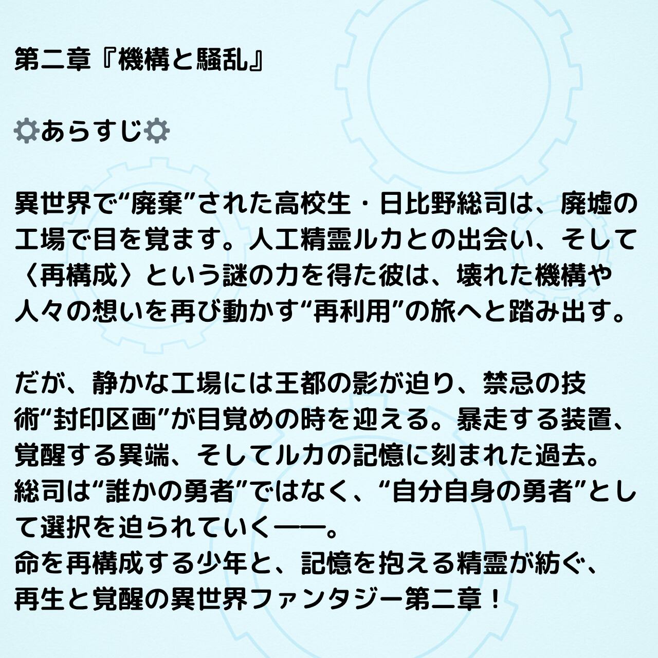 第一章で“再利用の勇者”として目覚めた総司は、仲間との出会いと試練を経て、再び動き出した異世界の工場で新たな選択を迫られることに。