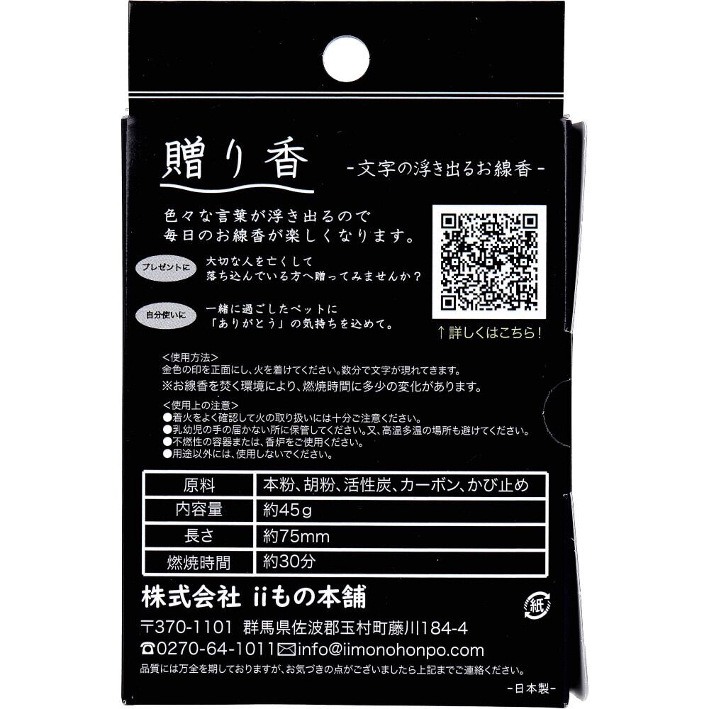 ●火を灯すと灰がそのまま残ってゆっくりと文字が浮き出てくるお線香です。